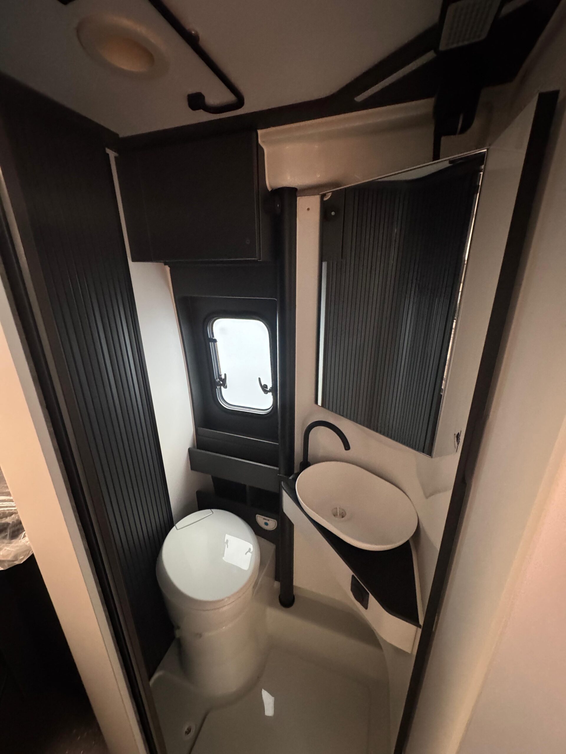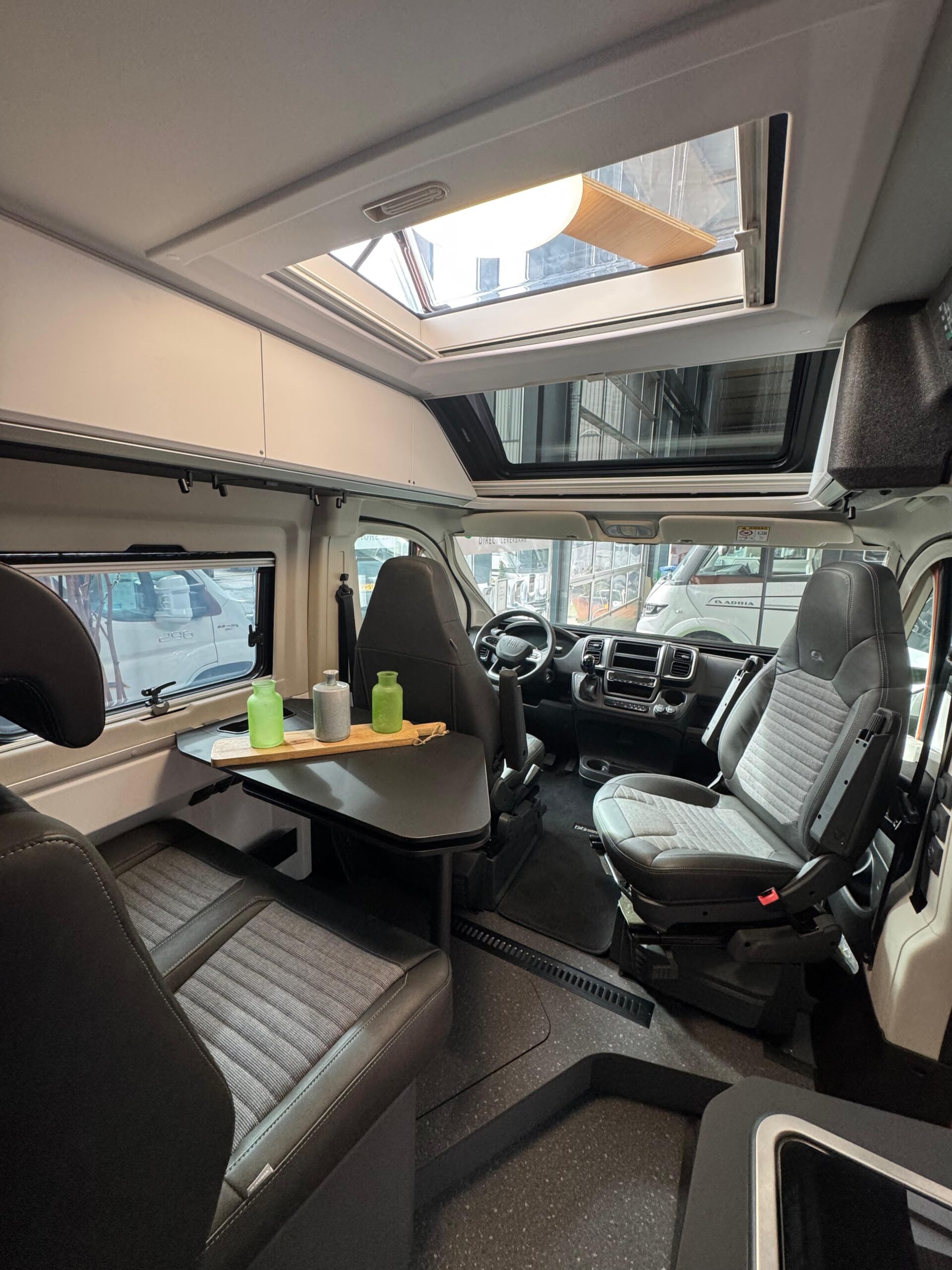 De badkamer is ruim en slim opgezet. Je vindt er het toilet en een praktische wastafel met spiegel met spotjes. De draaiwand met douche zorgt ervoor dat de ruimte zo optimaal benut wordt. Ook de zithoek is comfortabel ingericht met de twee ergonomische draaistoelen voorin, de 2-zitsbank en de verplaatsbare tafel.
