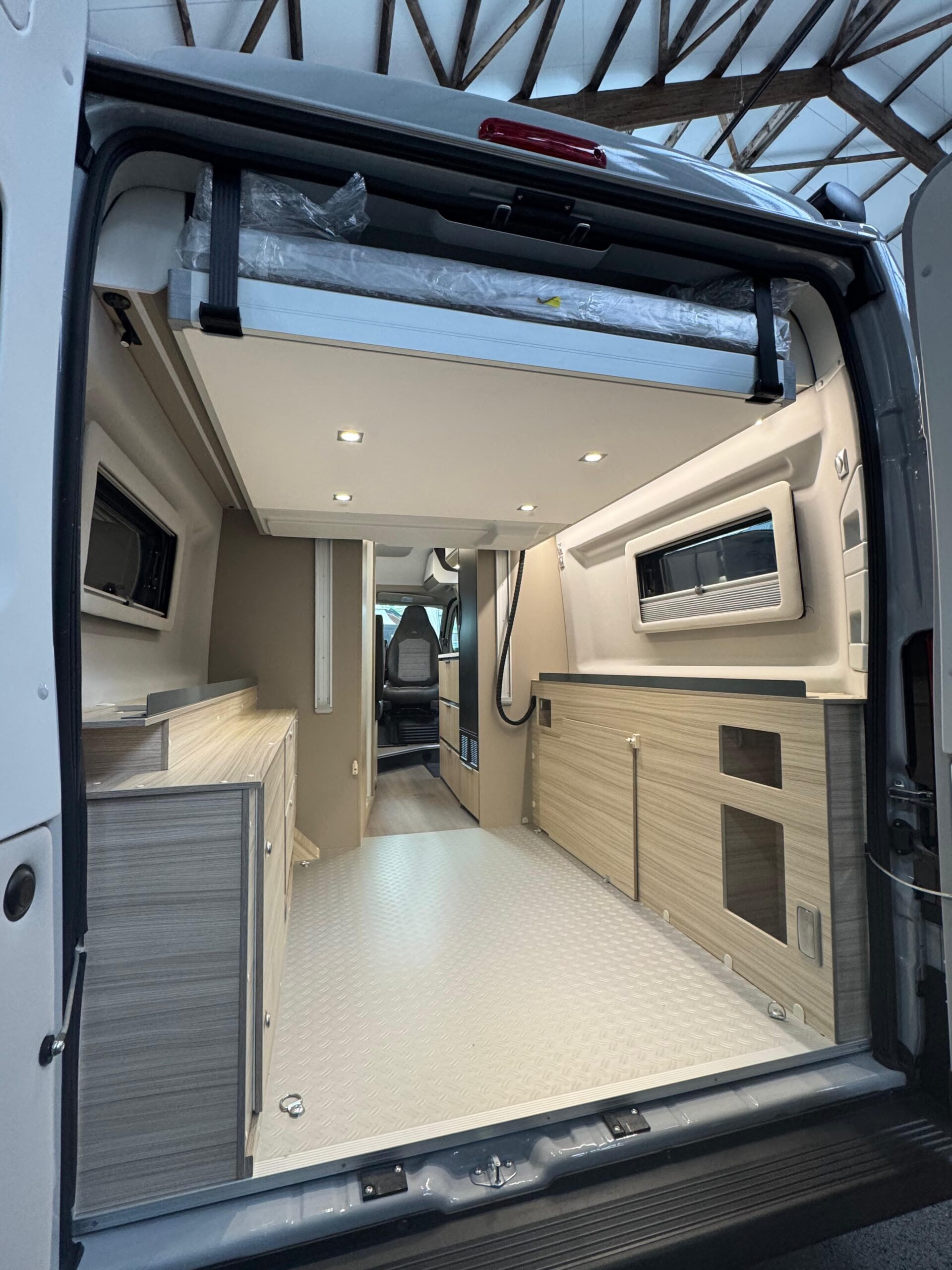 Deze camper onderscheidt zich van de rest door het elektrische hefbed achterin de camper, waardoor je veel flexibele opbergruimte hebt.