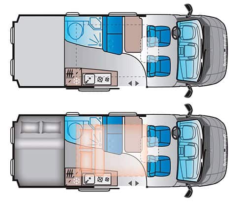 Naast het vaste dwarsbed achterin de camper, heeft de Sun Living dus 4 vaste bedden, zonder telkens de zithoek om te hoeven bouwen!